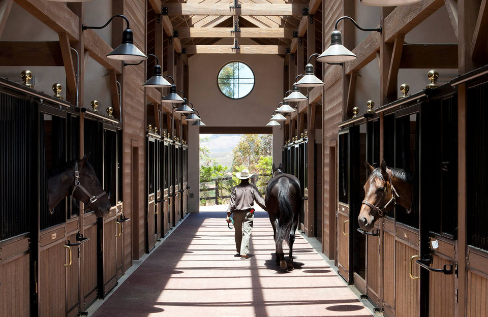 Near the Pacific Ocean, this property is situated to capture enviable views of the horizon and beautiful sunsets beyond. The 15-stall barn and clubhouse evoke an early 20th century Rancho Santa Fe style, but with contemporary detailing. The facility is used for hunter/jumper training. The clubhouse has a lounge with a full kitchen, an outdoor fireplace and patio, a guest suite, and a separate two-bedroom residence.