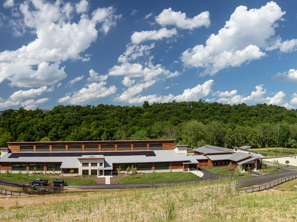 This highly energy efficient facility blends appropriately with its surrounding farmland. The design team began with the idea of creating a distinct horizon – modern but with a warm feel. This led to design decisions emphasizing the length of the building while accentuating the vertical elements in the center tack room and second floor lounge spaces.